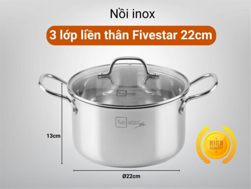 Nồi inox 3 lớp liền thân Fivestar 22cm đường kính 22cm, cao 13cm, dung tích 5 lít. Nồi được làm từ chất liệu inox 304 cao cấp, chống gỉ sét, bền bỉ và dễ vệ sinh. Đặc biệt là cấu tạo đáy 3 lớp liền thân bắt nhiệt tốt và toả nhiệt đều , giúp nấu ăn ngon hơn, đặc biệt có thể sử dụng được trên mọi loại bếp: bếp gas, bếp từ, bếp hồng ngoại. Nắp nồi thuỷ tinh chịu nhiệt, chịu lực, dễ quan sát, cùng 2 quai nồi cách nhiệt an toàn, thuận tiện sử dụng.