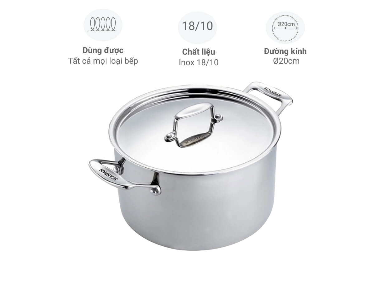 Nồi inox 5 lớp liền thân Scanpan Fusion 24cm là lựa chọn hoàn hảo cho gian bếp hiện đại. Nồi được đúc liền thân 5 lớp, giúp truyền nhiệt nhanh, giữ nhiệt tốt và phân bổ nhiệt đều, đảm bảo thức ăn chín đều. Chất liệu inox 18/10 cao cấp, kiểu dáng bóng sáng sang trọng, cùng tay cầm chống nóng chắc chắn và nắp inox bền bỉ, mang đến trải nghiệm nấu nướng an toàn, tiện lợi và lâu dài.