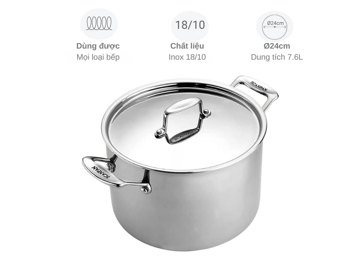 Nồi inox 5 lớp liền thân Scanpan Fusion 24cm dung tích lớn 7.6 lít, lý tưởng để nấu súp, hầm hoặc luộc thực phẩm