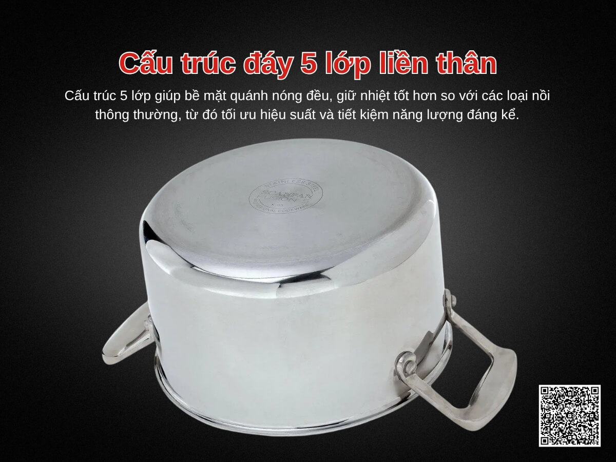 Cấu trúc 5 lớp liền thân giúp phân phối nhiệt nhanh và đều khắp đáy lẫn thành nồi