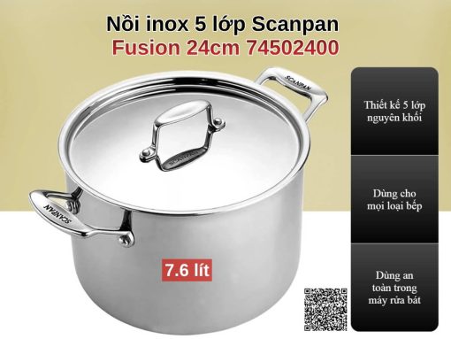 Nồi inox 5 lớp liền thân Scanpan Fusion 24cm 74502400 dung tích 7.6 lít được làm từ inox 18/10 cao cấp, đúc liền thân 5 lớp giúp truyền nhiệt nhanh và đều. Nắp inox bền chắc, tay cầm chống nóng an toàn, nồi thích hợp cho mọi loại bếp, dễ vệ sinh và mang đến trải nghiệm nấu nướng tiện lợi, sang trọng cho gian bếp.