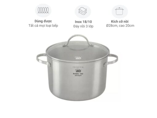 Nồi luộc gà Elo Multilayer Premium 28cm đường kính 28cm, cao 20cm, dung tích 10 lít, phù hợp luộc gà, hầm xương… Nồi được làm từ chất liệu inox 18/10 cao cấp, chống gỉ sét, bền bỉ và dễ vệ sinh. Đặc biệt là cấu tạo đáy 3 lớp liền thân bắt nhiệt tốt và toả nhiệt đều , giúp nấu ăn ngon hơn, đặc biệt có thể sử dụng được trên mọi loại bếp: bếp gas, bếp từ, bếp hồng ngoại. Nắp nồi thuỷ tinh chịu nhiệt, chịu lực, dễ quan sát, cùng 2 quai nồi cách nhiệt an toàn, thuận tiện sử dụng.