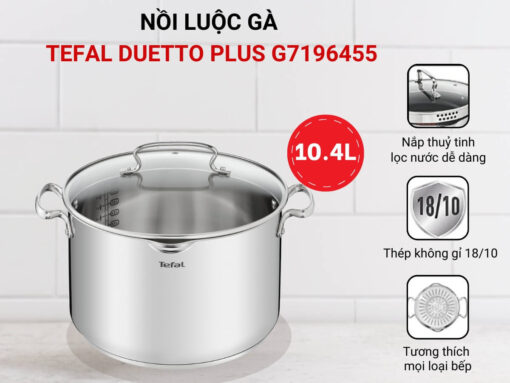 Nồi luộc gà Tefal Duetto Plus G7196455 28cm dung tích lớn 10.4 lít thuận tiện để luộc gà, hầm, nấu súp với lượng lớn cho gia đình đông người. Chất liệu inox không gỉ 18/10 cao cấp với đặc tính chống gỉ, chống ăn mòn, đáy 3 lớp dẫn nhiệt tốt và giữ nhiệt lâu, giúp nấu ăn ngon hơn và đảm bảo an toàn sức khoẻ. Đặc biệt là có thể dùng trên mọi loại bếp kể cả bếp từ. Ngoài ra, thiết kế nồi có miệng rót và nắp nồi có lỗ chắt nước tiện dụng.