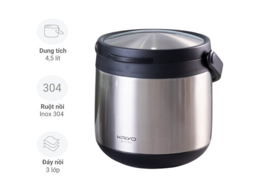 Nồi ủ Kaiyo KTC45S là một dụng cụ nấu ăn vô cùng hữu ích, giúp bạn nấu các món ninh, hầm, nấu cháo dễ dàng, tiết kiệm thời gian nấu mà không tốn nhiều gas, điện. Thiết kế nồi ủ đặc biệt cùng với nguyên lý giữ nhiệt chân không giúp nấu nhừ và ủ nóng thức ăn cả ngày, rất tiện lợi, không cần phải canh giữ bếp lúc nấu, không cần hâm nóng lại, đặc biệt là bảo toàn được tối đa dinh dưỡng trong thực phẩm. Dung tích nồi 4,5 lít phù hợp dùng cho gia đình 4-6 người. Đặc biệt, nồi có thể dùng trên mọi loại bếp, kể cả bếp từ.