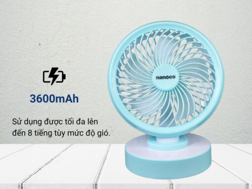 Quạt tích điện Nanoco NRF6213G trang bị viên pin dung lượng lớn đến 3600mAh, sử dụng được 3-7 tiếng, có thể di chuyển sử dụng ở những nơi không có ổ điện, linh hoạt mà không cần phải cắm điện liên tục.