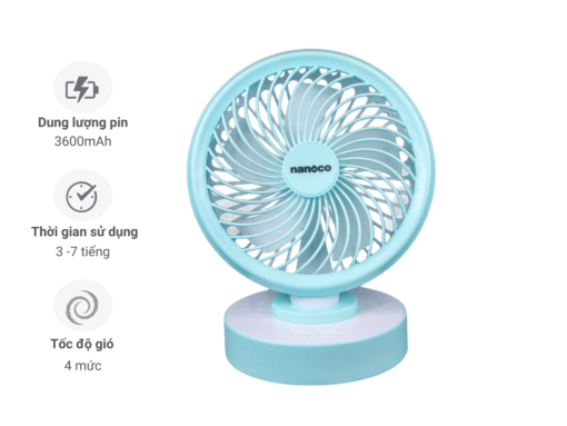 Quạt tích điện Nanoco NRF6213G tích hợp pin dung lượng 3600mAh, thiết kế nhỏ gọn, trọng lượng nhẹ, dễ dàng di chuyển, sử dụng bất cứ nơi nào. 4 mức độ gió tuỳ chỉnh chỉ với 1 nút nhấn trên quạt, có thể xoay để làm mát không gian xung quanh.