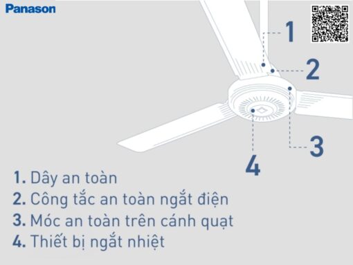 Đối với những sản phẩm quạt trần thì độ chắc chắn, an toàn của sản phẩm là điều người dùng đặc biệt quan tâm. Và với quạt trần Panasonic F-56NCL-S thì bạn hoàn toàn có thể yên tâm vì quạt có 4 tính năng bảo vệ an toàn tối đa cho người dùng: