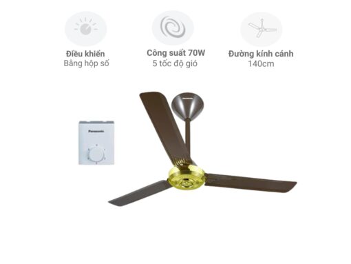 Quạt trần Panasonic F-56NCL-S sở hữu gam màu đồng sang trọng, phù hợp với phong cách nội thất cổ điển. Thiết kế 3 cánh quạt với đường kính sải rộng 140cm cho hiệu quả làm mát tốt. Với 5 tốc độ gió điều chỉnh linh hoạt, đáp ứng tốt nhu cầu sử dụng của mọi người dùng.