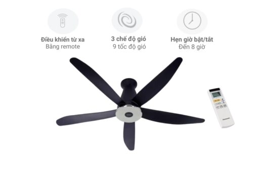Quạt trần Panasonic F-60XDN sở hữu gam màu đen sang trọng, phù hợp với nhiều phong cách nội thất. Thiết kế 5 cánh quạt với đường kính sải rộng 150cm cho hiệu quả làm mát tốt. Với 3 chế độ gió cùng 9 tốc độ gió điều chỉnh linh hoạt, đáp ứng tốt nhu cầu sử dụng của mọi người dùng. Điều khiển từ xa bằng remote tiện dụng, có chế độ hẹn giờ bật/tắt quạt đến 8 giờ đem đến sự tiện lợi tối đa.