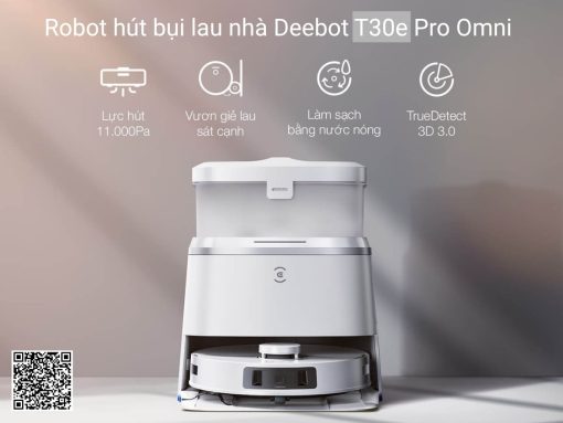 Robot Ecovacs Deebot T30e Pro Omni sở hữu lực hút 11.000 Pa và hệ thống lau xoay tiên tiến làm sạch bụi, tóc, lông thú và vết bẩn ướt, cùng thiết kế lau cạnh TruEdge tiếp cận mọi ngóc ngách. Công nghệ TrueDetect 3D 3.0 giúp tránh vật cản chính xác, vượt chướng ngại vật cao 20 mm. Trạm sạc mini đa năng tự động sạc pin, hút rác và giặt giẻ lau bằng nước nóng 70 °C, mang lại trải nghiệm tiện dụng tối đa.