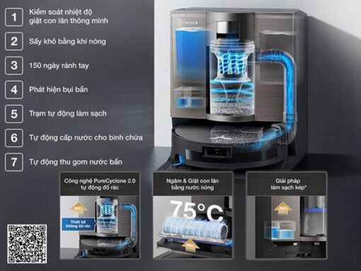• Tự động giặt con lăn bằng nước nóng 75°C: Trạm sạc sẽ tự động giặt con lăn bằng nước nóng 75°C, không chỉ làm sạch hiệu quả các vết bẩn cứng đầu như dầu mỡ mà còn giúp diệt khuẩn, khử mùi hôi và nấm mốc.
