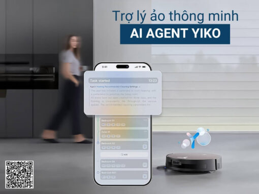 Bạn có thể trò chuyện và ra lệnh cho robot của mình thông qua trợ lý ảo thông minh AI AGENT YIKO. YIKO có khả năng học hỏi thói quen của gia đình để đề xuất lịch trình vệ sinh và thực hiện các mệnh lệnh bằng giọng nói tự nhiên như: bật, tắt, chỉ định khu vực vệ sinh, điều chỉnh lực hút…