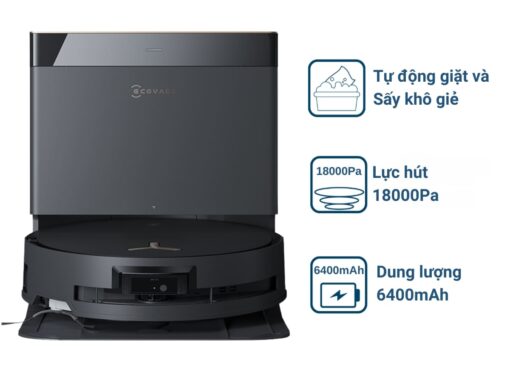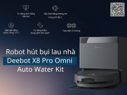 Robot Ecovacs Deebot X8 Pro Omni Auto Water Kit ứng dụng công nghệ lau sàn tái tạo nước OZMO Roller đột phá, cho hiệu quả làm sạch vượt trội, cùng thiết kế lau cạnh TruEdge 2.0 giúp làm sạch mọi ngóc ngách khó vệ sinh. Bên cạnh đó là lực hút mạnh mẽ 18000Pa, giúp hút sạch mọi bụi bẩn, lông thú cưng. Công nghệ điều hướng AIVI 3D 3.0 cho khả năng tránh vật cản chính xác, khả năng vượt chướng ngại vật cao 20mm, giẻ lau tự nâng 10mm khi gặp thảm… Đặc biệt là trạm sạc toàn năng tự động sạc pin, tự đổ đầy và xả nước, tự thêm dung dịch nước lau nhà, tự hút rác từ robot, giặt giẻ lau bằng nước nóng 70°C và sấy khô giẻ lau bằng khí nóng 63°C…