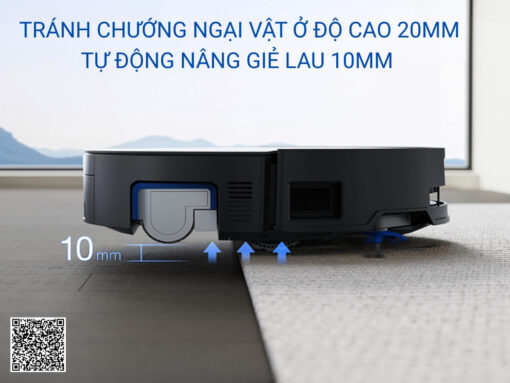 Khả năng tránh chướng ngại vật ở độ cao 20mm và tự động nâng giẻ lau 10mm mỗi khi đi qua thảm, đảm bảo không gây ẩm ướt cho mặt thảm bên dưới.