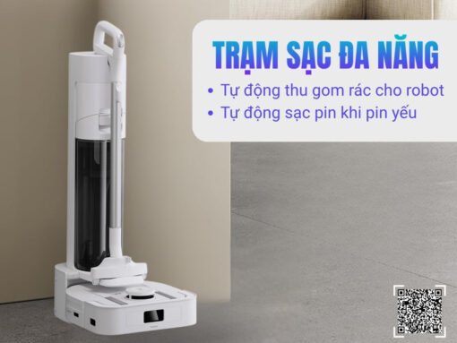 Trạm sạc có chức năng tự động thu gom rác cho robot. Mọi bụi bẩn, mảnh rác, lông thú cưng… trong hộp bụi robot sẽ được tự động đổ vào hộp chứa bụi của trạm sạc. Hộp chứa bụi này có dung tích 3.2L cùng với thiết kế khép kín hoàn toàn, giúp ngăn bụi thoát ra ngoài, và cho thời gian sử dụng lên đến 90 ngày, do đó bạn không cần phải đổ bụi thường xuyên.