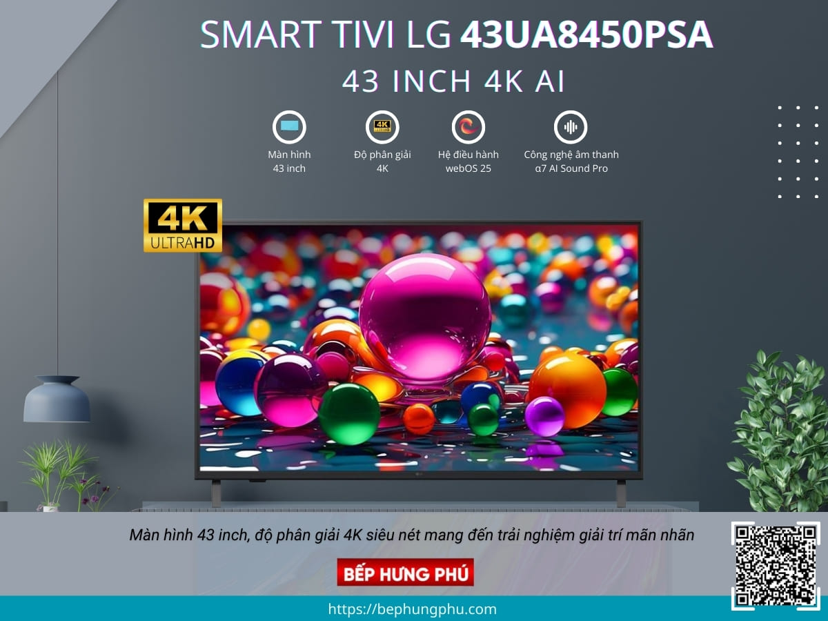 Smart Tivi LG 43UA8450PSA AI 4K 43 inch thiết kế tinh tế, sang trọng sẽ là điểm nhấn cho không gian nội thất của bạn. Màn hình 43 inch cùng độ phân giải 4K siêu nét mang đến trải nghiệm giải trí mãn nhãn. Tivi được trang bị bộ xử lý α7 AI Processor 4K Gen8, công nghệ nâng cấp độ phân giải hình ảnh 4K Super Upscaling, công nghệ âm thanh α7 AI Sound Pro, hệ điều hành webOS 25 tiến tiến, mang đến chất lượng hình ảnh và âm thanh đỉnh cao.