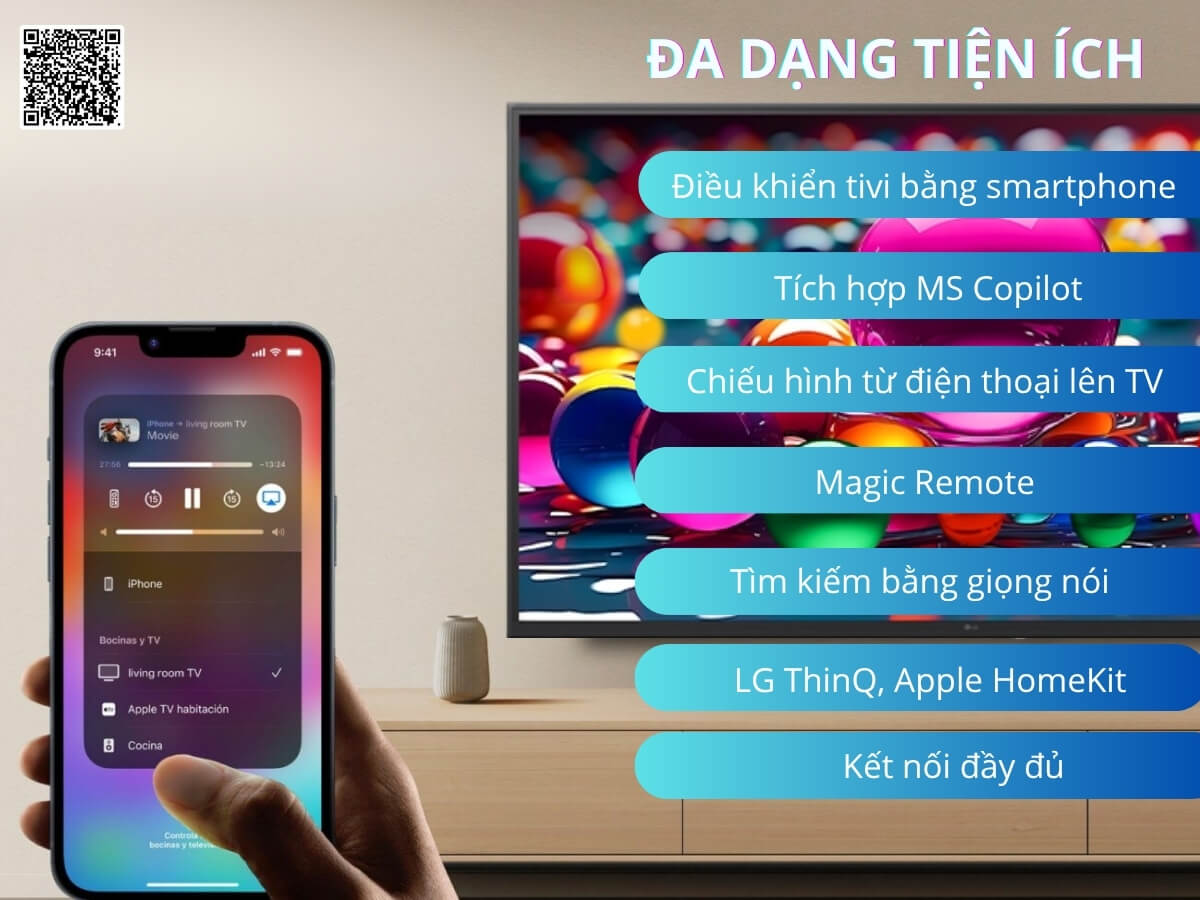 Chiếu hình từ điện thoại lên TV: Hỗ trợ cả LG ThinQ, Chromecast và AirPlay 2, dễ dàng chia sẻ nội dung từ điện thoại lên màn hình lớn.