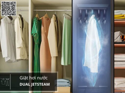 Cùng với thiết kế giá treo mở rộng Multi Hanger đảm bảo luồng khí và hơi nước tiếp xúc đều từng vị trí trên áo, tăng hiệu quả làm sạch và giữ dáng trang phục tốt hơn.