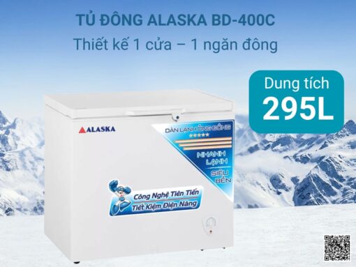 Tủ đông Alaska BD-400C thiết kế 1 cửa – 1 ngăn đông với dung tích 295 lít, phù hợp dùng cho quán ăn, hộ kinh doanh có qui mô vừa và nhỏ