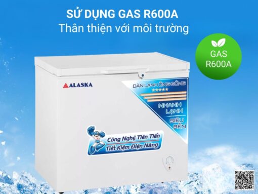 Tủ đông Alaska BD-400C sử dụng loại Gas R600A an toàn cao với người dùng, khả năng làm lạnh lâu và êm ái, đồng thời tiết kiệm điện năng khi sử dụng, thân thiện với môi trường.