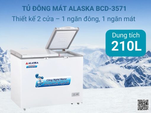 Tủ đông mát Alaska BCD-3571 thiết kế 2 cửa – 1 ngăn đông, 1 ngăn mát riêng biệt với dung tích tổng 210 lít, phù hợp dùng cho quán ăn, căn tin, cửa hàng… qui mô nhỏ, nhu cầu bảo quản thực phẩm ít. Tủ được trang bị dàn lạnh nhôm làm lạnh nhanh và giúp làm lạnh hiệu quả. Tủ còn được trang bị nhiều tiện ích như: có giỏ đựng đồ bên trong, bánh xe dễ dàng di chuyển, có khoá nắp tủ an toàn…