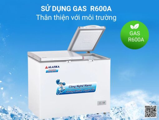 Tủ đông mát Alaska BCD-3571 sử dụng loại Gas R600a an toàn cao với người dùng, khả năng làm lạnh lâu và êm ái, đồng thời tiết kiệm điện năng khi sử dụng, thân thiện với môi trường.