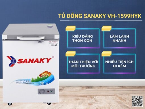 Tủ đông Sanaky VH-1599HYKD thiết kế dạng tủ mini 1 cửa – 1 ngăn đông, dung tích 100 lít, phù hợp dùng cho gia đình, quán ăn, tiệm tạp hóa nhỏ, nhu cầu bảo quản thực phẩm ít.