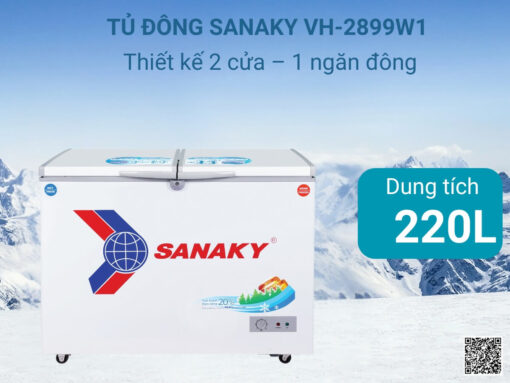 Tủ đông Sanaky VH-2899W1 thiết kế 2 cửa – 1 ngăn đông, 1 ngăn mát với dung tích tổng 220 lít, phù hợp dùng cho quán ăn, cửa hàng tiện lợi… qui mô vừa, nhu cầu bảo quản thực phẩm không quá lớn. Tủ được trang bị dàn lạnh đồng bền bỉ và giúp làm lạnh hiệu quả. Tủ còn có nhiều tiện ích như: có giỏ đựng đồ bên trong, bánh xe dễ dàng di chuyển, có khoá nắp tủ an toàn…