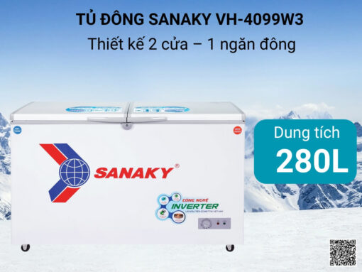 Tủ đông Sanaky VH-4099W3 thiết kế 2 cửa – 1 ngăn đông, 1 ngăn mát tổng dung tích 280 lít