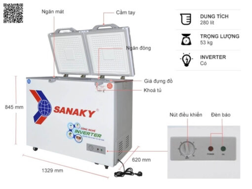 Tủ đông Sanaky VH-4099W4K thiết kế 2 cửa – 1 ngăn đông, 1 ngăn mát với dung tích tổng 280 lít, phù hợp dùng cho quán ăn, cửa hàng tiện lợi… qui mô vừa, nhu cầu bảo quản thực phẩm không quá lớn. Tủ được trang bị dàn lạnh đồng bền bỉ và giúp làm lạnh hiệu quả. Công nghệ Inverter giúp tiết điệm điện tối ưu. Tủ còn được trang bị nhiều tiện ích như: có giỏ đựng đồ bên trong, bánh xe dễ dàng di chuyển, có khoá nắp tủ an toàn…