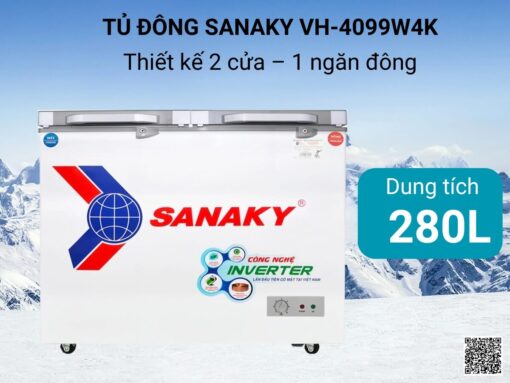 Tủ đông Sanaky VH-4099W4K được thiết kế dạng 2 cửa – 1 ngăn đông 110 lít, 1 ngăn mát 170 lít, tổng dung tích 280 lít, phù hợp dùng cho quán ăn hoặc cửa hàng tiện lợi qui mô vừa, với nhu cầu bảo quản thực phẩm không quá lớn.