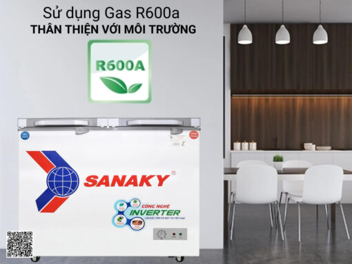 Tủ đông Sanaky VH-4099W4K sử dụng loại Gas R600a an toàn cao với người dùng, khả năng làm lạnh lâu và êm ái, đồng thời tiết kiệm điện năng khi sử dụng, thân thiện với môi trường.