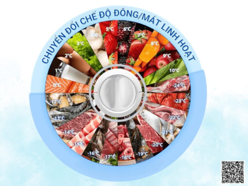 - Nhiệt độ ngăn đông: -24℃ đến -12℃, phù hợp bảo quản kem, thịt, hải sản…