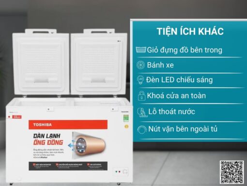 Tủ đông Toshiba GR-RC470CM-PMV(01) thiết kế 2 cửa – 1 ngăn đông với dung tích 362 lít, phù hợp dùng cho nhà hàng, quán ăn, cửa hàng tiện lợi… vừa và lớn, nhu cầu bảo quản thực phẩm nhiều, đa dạng. Tủ được trang bị dàn lạnh đồng bền bỉ và giúp làm lạnh hiệu quả, cùng với vật liệu xốp cách nhiệt có thể giữ đông thực phẩm đến 100 giờ khi mất điện. Công nghệ Inverter giúp tiết điệm điện hiệu quả. Đặc biệt tủ có thể chuyển đổi 2 chế độ đông và mát để linh hoạt sử dụng theo nhu cầu. Tủ còn được trang bị nhiều tiện ích như: có giỏ đựng đồ bên trong, đèn LED chiếu sáng, bánh xe dễ dàng di chuyển, có khoá nắp tủ an toàn…