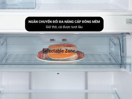 Tủ lạnh Hitachi R-FVX480PGV9 GBK có ngăn chuyển đổi đa năng Selectable Zone cho phép điều chỉnh nhiệt độ linh hoạt 3 mức gồm: làm mát 3°C (bảo quản đồ uống, thực phẩm), làm lạnh 0°C (bảo quản bơ sữa, thịt, các thực phẩm tươi), cấp đông mềm -3°C (giữ thịt cá tươi lâu, sẵn sàng để nấu ăn ngay mà không cần rã đông). Ngăn chuyển đổi đa năng này đáp ứng nhu cầu bảo quản đa dạng thực phẩm.