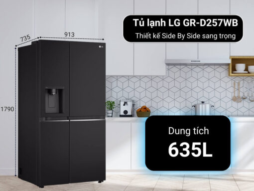 Tủ lạnh LG GR-D257WB kiểu dáng Side by Side sang trọng, tinh tế, màu đen dễ kết hợp với mọi không gian nội thất. Với dung tích lớn 635 lít cùng hệ thống làm lạnh đa chiều và công nghệ làm lạnh từ cánh cửa tủ tiên tiến, giúp bảo quản thực phẩm hiệu quả, duy trì độ tươi ngon dài lâu. Công nghệ Inverter giúp tiết kiệm điện năng hiệu quả. Bên cạnh đó còn có chức năng làm đá tự động và lấy đá, lấy nước mát bên ngoài của tủ, cung cấp tự tiện lợi tối đa cho người dùng.