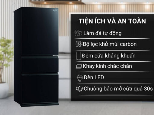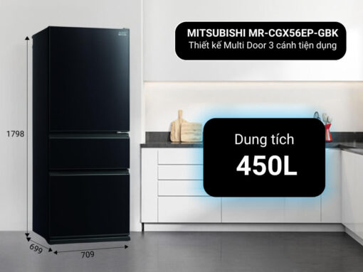 Tủ lạnh Mitsubishi MR-CGX56EP-GBK thiết kế Multi Door 3 cánh với mặt kính đen tinh tế, sang trọng, dung tích lớn 450 lít đáp ứng tốt nhu cầu