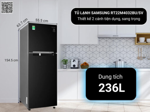 Tủ lạnh Samsung RT22M4032BU/SV sở hữu dung tích 236 lít, phù hợp với gia đình có 2-3 thành viên, nhu cầu bảo quản thực phẩm không quá lớn.