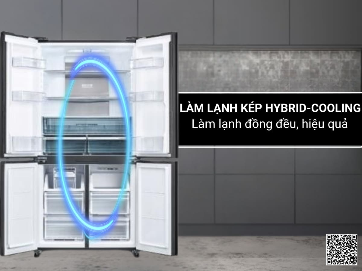 Tủ lạnh Sharp SJ-FX650V-SL 572L trang bị công nghệ làm lạnh kép Hybrid-cooling, phân phối luồng không khí lạnh đồng đều khắp khoang tủ. Hệ thống này cung cấp khả năng làm lạnh đều, ổn định, giúp giữ thực phẩm tươi ngon hơn dưới luồng khí lạnh nhẹ nhàng.