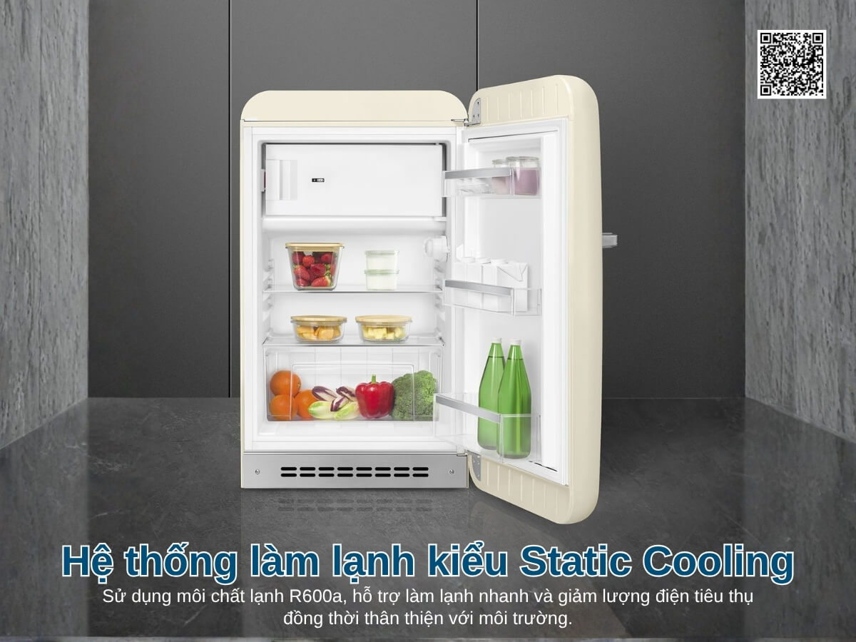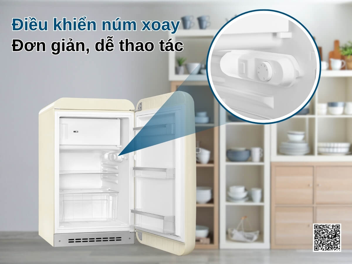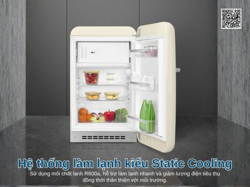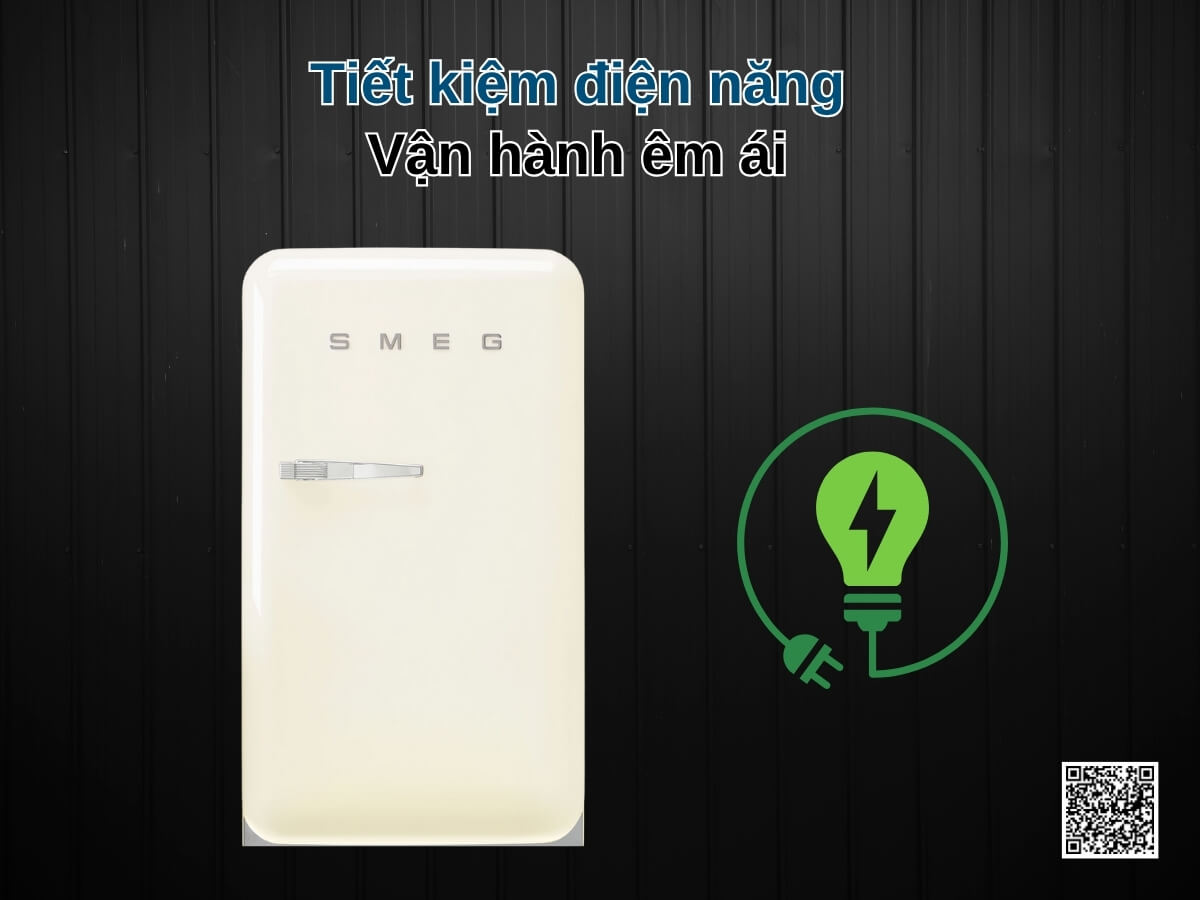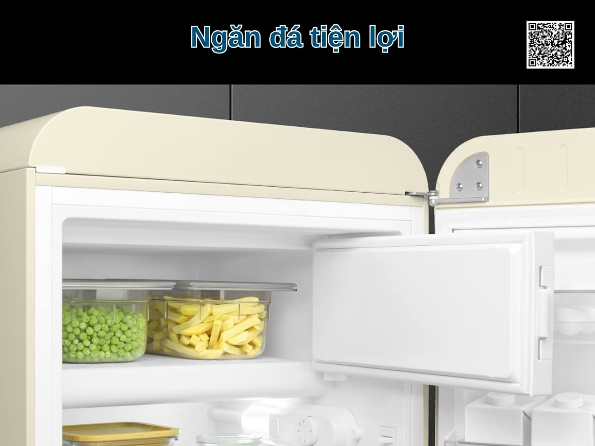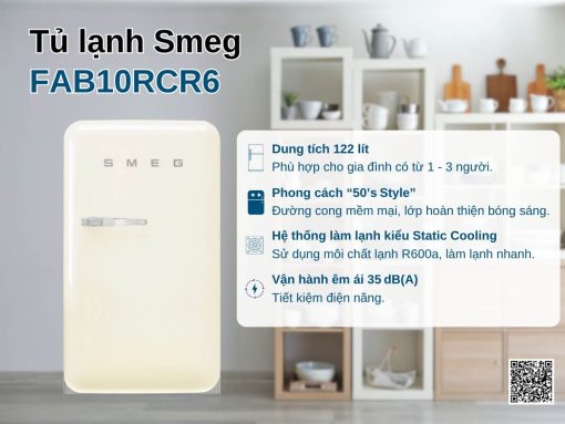 Tủ lạnh Smeg FAB10RCR6 mang phong cách Retro thập niên 50 độc đáo với thiết kế bo tròn và màu kem sang trọng. Dung tích 122 lít, phù hợp cho gia đình 1-3 người hoặc không gian nhỏ như văn phòng, phòng khách sạn. Máy vận hành êm ái với độ ồn chỉ 35 dB, sử dụng gas R600a tiết kiệm điện, kết hợp cửa mở tay nắm chrome và đèn LED bên trong tạo nên sự tiện nghi đầy phong cách.