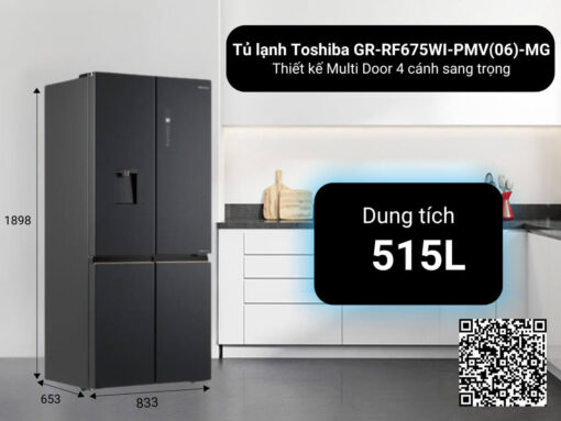 Tủ lạnh Toshiba GR-RF675WI-PMV(06)-MG dung tích 515 lít là lựa chọn lý tưởng cho gia đình 4-6 thành viên. Hệ thống làm lạnh đa chiều Multi Air Flow giúp làm lạnh đồng đều, hiệu quả, bảo quản thực phẩm tươi ngon lâu hơn. Công nghệ Inverter giúp tiết kiệm điện tối ưu. Đặc biệt có ngăn chuyển đổi Flexible Zone có thể cấp đông mềm thịt cá mà không cần rã đông… Ngoài ra còn có bảng điều khiển cảm ứng ngoài cửa tủ và tính năng lấy nước mát bên ngoài, đem đến sự tiện lợi tối đa cho người dùng.