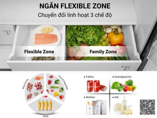 Bạn có thể sử dụng ngăn Flexible Zone để bảo quản rau củ quả, sữa chua, phô mai, làm lạnh nhanh đồ uống, đặc biệt là cấp đông mềm thực phẩm tươi sống như thịt, cá… tươi ngon đến 3-4 ngày mà không cần cấp đông cứng, có thể chế biến ngay mà không cần rã đông.