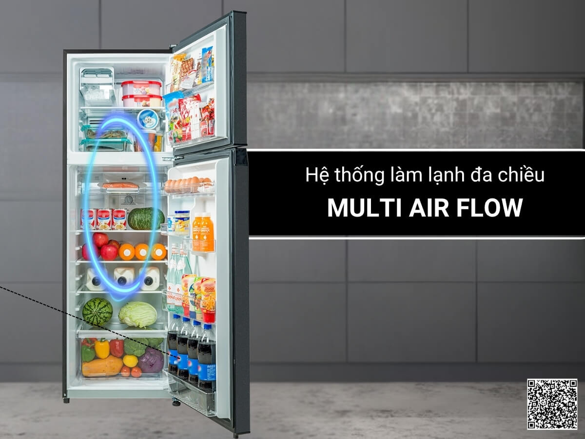 Tủ lạnh Toshiba GR-RT329S-PMV(52) trang bị hệ thống làm lạnh đa chiều Multi Air Flow, phân phối luồng không khí lạnh đồng đều đến mọi ngóc ngách trong khoang tủ. Hệ thống này giúp duy trì nhiệt độ ổn định, giữ thực phẩm tươi ngon lâu hơn.
