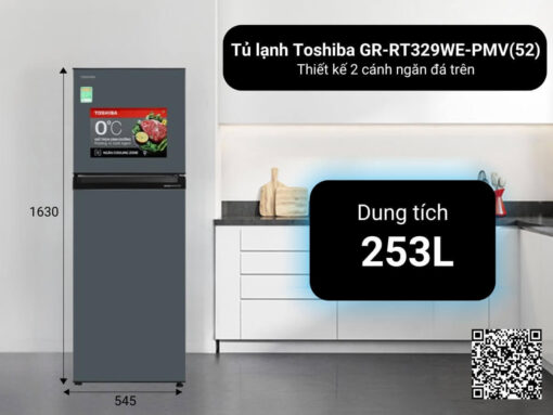 Tủ lạnh Toshiba GR-RT329WE-PMV(52) thiết kế tủ 2 cánh với ngăn đá trên quen thuộc, dung tích tổng 253 lít phù hợp cho gia đình 2 – 3 người