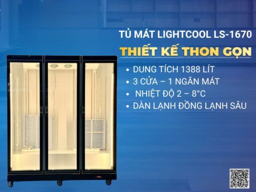 Tủ mát 3 cửa Lightcool LS-1670 thiết kế 3 cửa – 1 ngăn mát với dung tích lớn 1388 lít, phù hợp dùng cho siêu thị, nhà hàng, quán ăn lớn… nhu cầu bảo quản và trưng bày thực phẩm lớn. Tủ được trang bị dàn lạnh đồng bền bỉ, giúp làm lạnh nhanh và sâu. Cửa kính với hệ thống sưởi kính giúp chống đọng sương, dễ dàng quan sát bên trong.