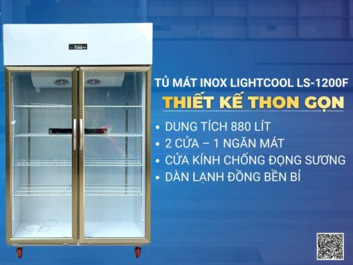 Tủ mát inox 2 cửa Lightcool LS-1200F thiết kế 2 cửa – 1 ngăn mát với dung tích lớn 880 lít, phù hợp dùng cho siêu thị, nhà hàng, quán ăn lớn… nhu cầu bảo quản và trưng bày thực phẩm lớn. Tủ được trang bị dàn lạnh đồng bền bỉ, giúp làm lạnh nhanh và sâu. Cửa kính với hệ thống sưởi kính giúp chống đọng sương, dễ dàng quan sát bên trong.