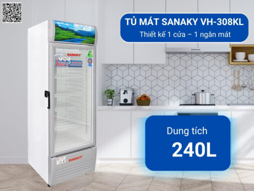 Tủ mát Sanaky VH-308KL thiết kế dạng tủ đứng 1 cửa – 1 ngăn mát với dung tích 240 lít, phù hợp dùng cho quán ăn, tạp hóa, cửa hàng tiện lợi  nhỏ