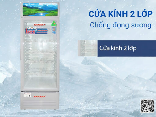 Tủ mát Sanaky VH-308KL thiết kế cửa kính 2 lớp Low-E cùng hệ thống gioăng cao su chắc chắn, chống thất thoát nhiệt, giúp bảo quản thực phẩm tốt hơn và tiết kiệm điện năng hiệu quả. Đặc biệt là khả năng chống đọng sương cùng hệ thống sưởi kính bằng hơi nóng, giữ được độ trong suốt cho kính, giúp quan sát rõ thực phẩm bên trong cũng như tăng hiệu quả trưng bày, quảng bá sản phẩm.