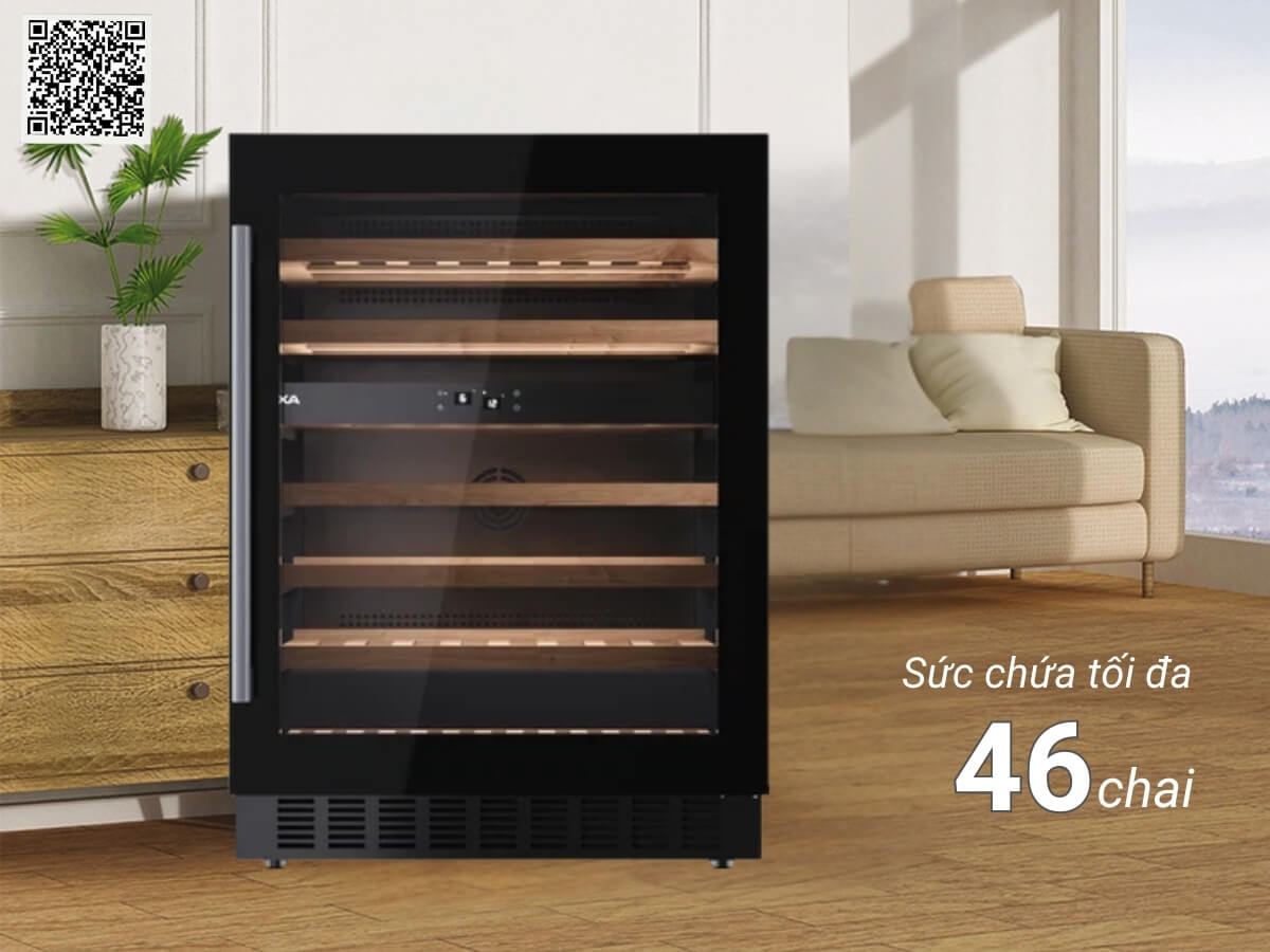 Tủ rượu Teka RVU 20046 GBK có sức chứa tối đa 46 chai rượu vang (chai 750ml tiêu chuẩn). Khoang chứa được thiết kế gồm 6 kệ gỗ sang trọng, giúp sắp xếp các chai rượu một cách khoa học và an toàn. Với sức chứa này, tủ rượu Teka là lựa chọn lý tưởng để sử dụng cho gia đình, các nhà sưu tầm rượu hoặc những quán bar, nhà hàng có quy mô vừa và nhỏ.