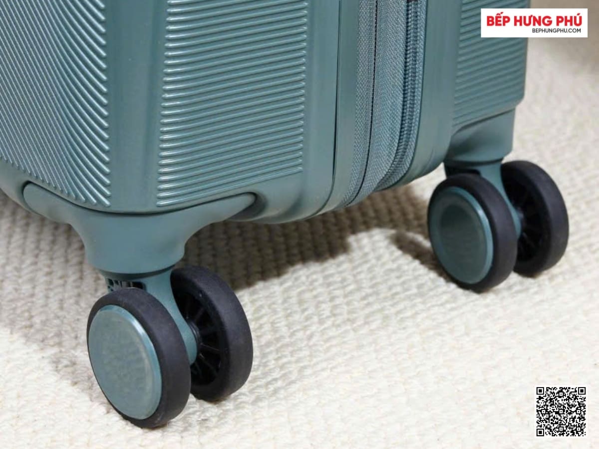 - Di chuyển êm ái, nhẹ nhàng: Hệ thống 4 bánh xe đôi có khả năng xoay 360 độ giúp vali di chuyển mượt mà, trơn tru trên mọi địa hình, giảm thiểu tối đa tiếng ồn và công sức khi kéo, đẩy.